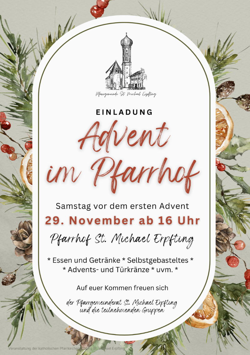 Kommt am 29. November ab 16 Uhr in den Pfarrhof St. Michael Erpfting und stimmt euch gemeinsam mit uns auf die Adventszeit ein.